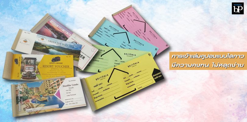 ประเภทคูปองที่นิยมเข้าเล่มแบบไสกาว : คูปองชิงโชค คูปองแทนเงินสด บัตรจอดรถ ตั๋วหรือบัตรเข้างานต่างๆ