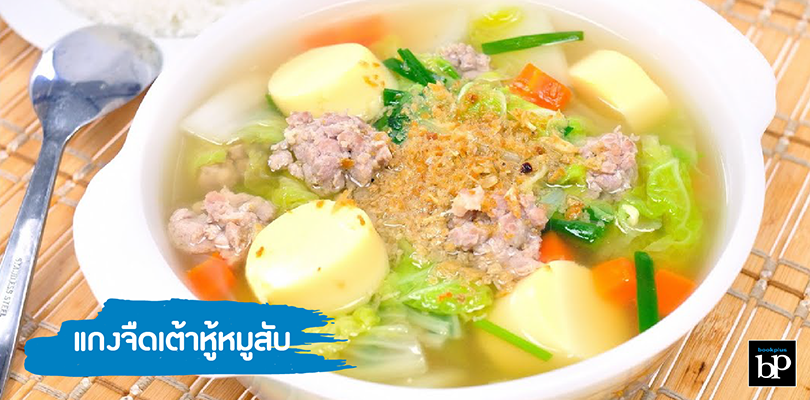 วิธีทำ เริ่มด้วยนำหม้อขึ้นตั้งไฟ เทน้ำเปล่าลงไป หลังจากนั้นนำกระเทียม พริกไทยเม็ดและรากผักชีโขลกให้ละเอียด แล้วนำใส่หม้อต้ม ปรุงรสด้วยเกลือ ซีอิ๊วขาวและน้ำปลา รอให้เดือดแล้วใส่หมูสับ เต้าหู้ไข่ ตามด้วยผักที่เตรียมไว้ ต้มจนหมูสุก ใส่ขึ้นฉ่ายและต้นหอม พร้อมเสิร์ฟได้เลย